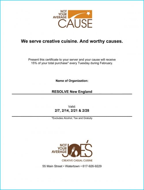 Print this NYA Cause Certificate Feb2012 and hand it to your server while dining out a Not Your Average Joe’s Creative Casual Cuisine (Watertown, MA) and Resolve New England will receive 15% OFF your total purchase (excluding Alcohol, Tax and Gratuity) every Tuesday during February. For more details visit their website.